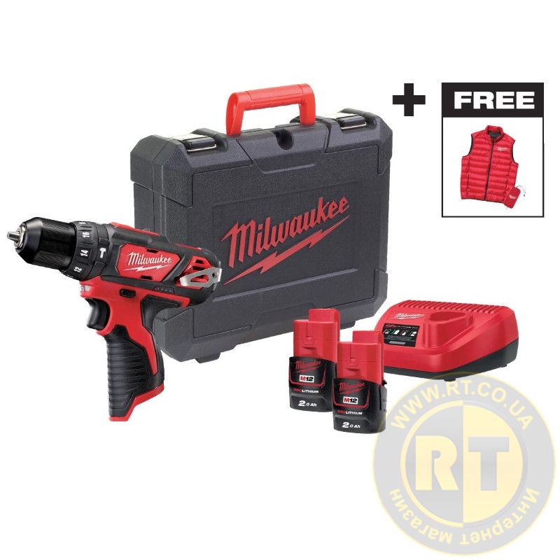 Дрель-шуруповерт аккумуляторная ударная MILWAUKEE M12 BPDMC-202C (30 Нм) + ЖИЛЕТКА