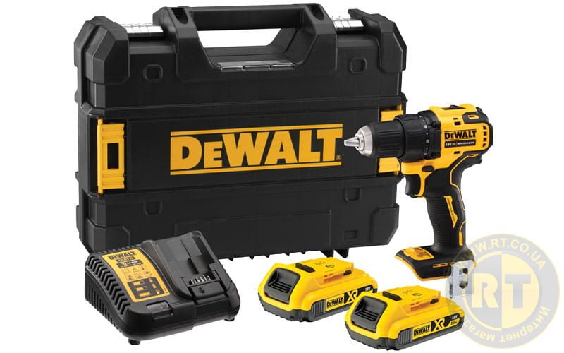 Компактная дрель-шуруповерт 18 В из линейки литий-ионных аккумуляторов DeWalt XR емкостью 2.0 Ач.