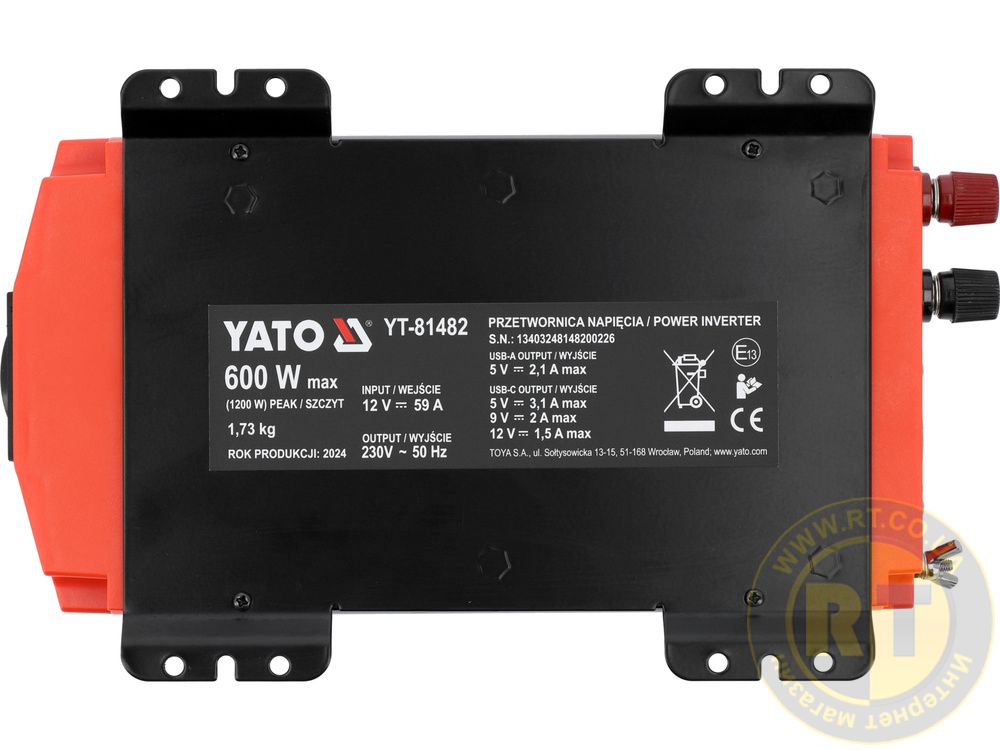 Преобразователь напряжения из источника 12 В DC в 230 В, номинально - 600 Вт AC, пиковый - 1200 Вт [5] Yato YT-81482