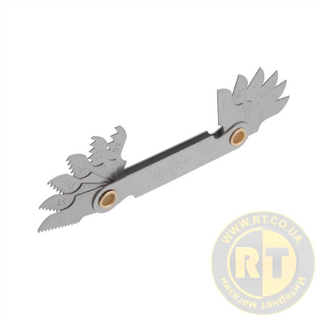Метрический резьбомер позволяет с высокой точностью определить шаг резьбы. Выбирают наиболее подходящий шаг, накладывают на резьбовую часть детали, подбор осуществляют до тех пор, пока зазор между зазубринами не будет минимальным.