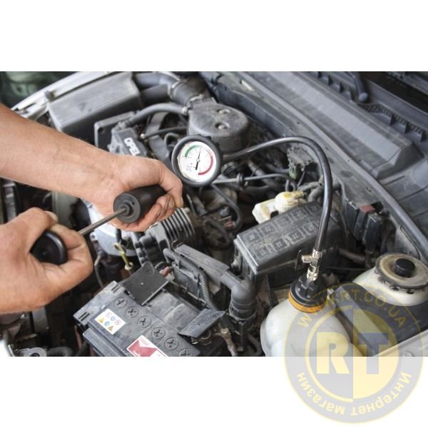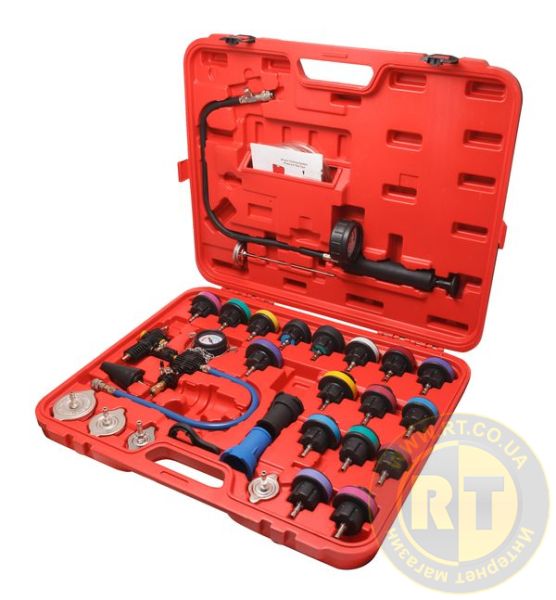 Дозволяє легко перевірити витік в системі радіатора та швидко замінити охолоджуючу рідину. Тестові ковпачки радіатора з кольоровим кодуванням дозволяють легко вибрати відповідний тестовий ковпачок для роботи. Спеціальна конструкція з’єднання інструменту для вакуумної продувки та заправки підходить майже до всіх типів отворів радіатора. У набір також входить набір інструментів для очищення та заправки системи охолодження вакуумного типу для швидкої заміни охолоджуючої рідини.