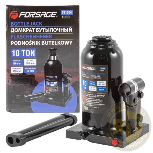 Домкрат гидравлический бутылочный Forsage F-T91004 используется для поднятия грузов массой до 10 т на высоту 190-360 мм. Подходит для автомобилей с высоким клиренсом. Домкрат будет полезен автолюбителям в гараже и дороге, а также сотрудникам СТО.