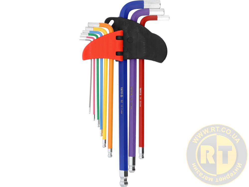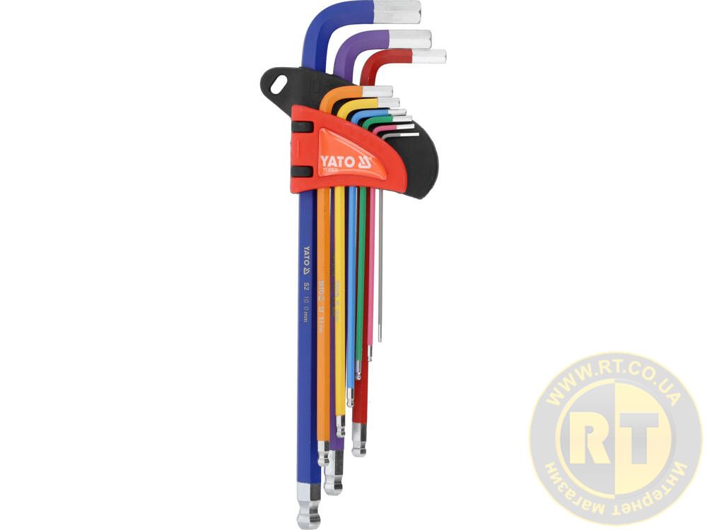 Ключи шестигранные с шаровидными наконечниками М1.5-10 мм, Г-образные, 2-стр, l=97-225 мм, 9 шт. Yato YT-05635