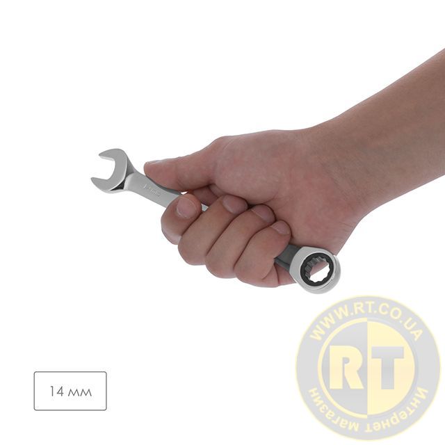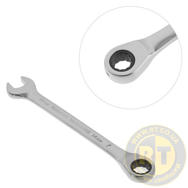 Комбинированный ключ с трещоткой, размером 14 мм предназначен для монтажа и демонтажа резьбовых соединений гаек и болтов.