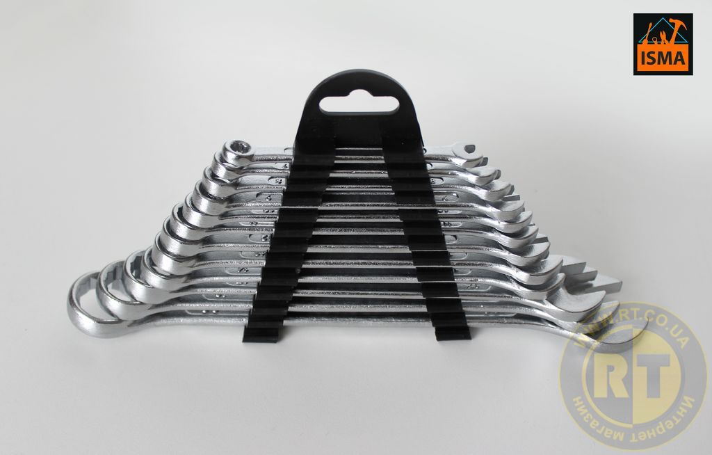 Набор ключей комбинированных ISMA IS-5123 - это набор из 12 двусторонних гаечных ключей с рожковой и накидной частями, предназначенных для производства монтажных и ремонтных работ. Этот набор ключей позволяет быстро затягивать или демонтировать резьбовые соединения, даже если они расположены в труднодоступных местах механизмов.