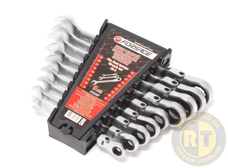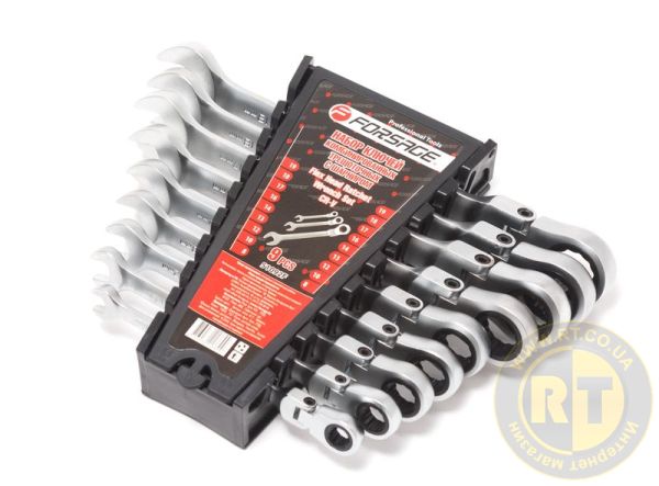 Код товара: 4678, Состав: Набор ключей комбинированных трещоточных с шарниром 9пр. (8,10,12,13,14,16,17,18,19мм)в пластиковом держателе Forsage F-51092F