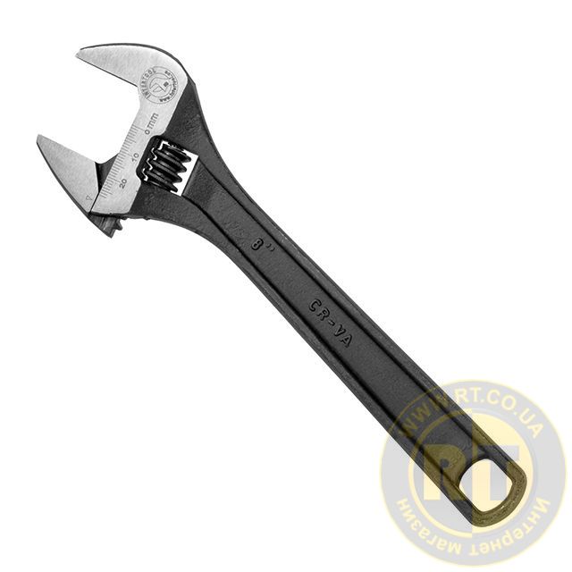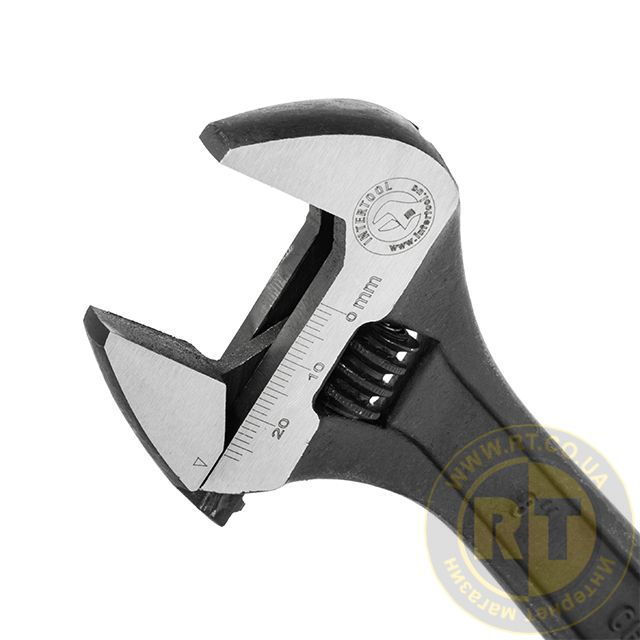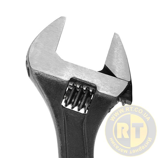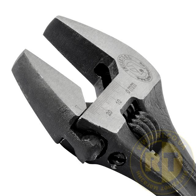 Разводной механизм прочный и не дает люфт в работе, благодаря конструкционным особенностям ключа. Точно откалибровать необходимый зазор (размер) для захвата крепежа позволяет нанесенная нестирающаяся миллиметровая шкала. Длинная ручка позволит удобно маневрировать разводным ключом и применять еще больше усилия.