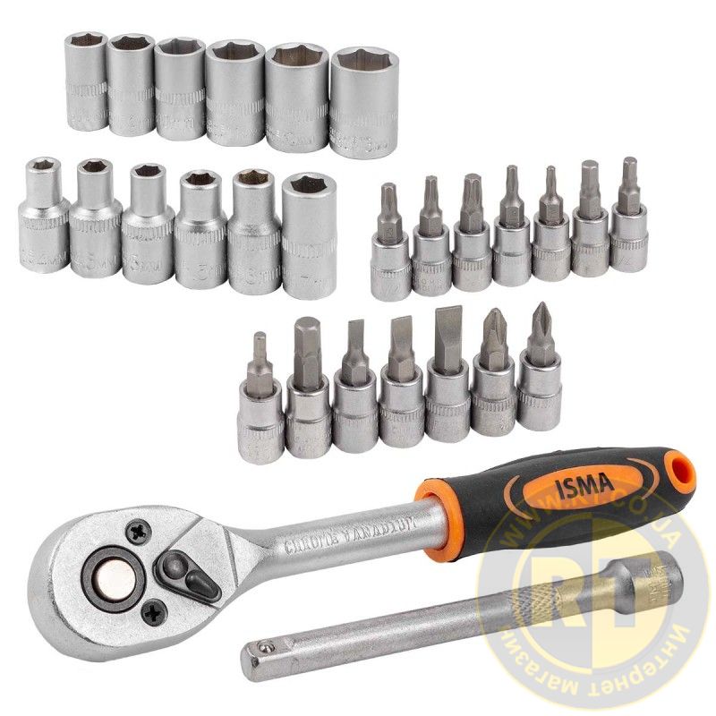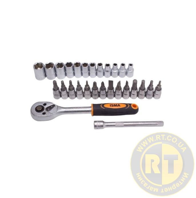 Набор ISMA IS-2028-5 включает в себя 28 предметов из стали CrV-группы с посадочным квадратом 1/4 дюйма: 12 торцевых головок(4-13мм), трещотку, удлинитель 100 мм и 14 бит(Torx:T10,15,20,25,30, Hex:3-6мм,SL:4,5.5,7мм, PH1,2). Он применяется для монтажа и демонтажа резьбовых соединений при проведении технического обслуживания авто или для бытовых ремонтных работ. Набор подходит не только для самостоятельного использования в гараже и дома, но и для профессиональной эксплуатации на станциях техобслуживания.