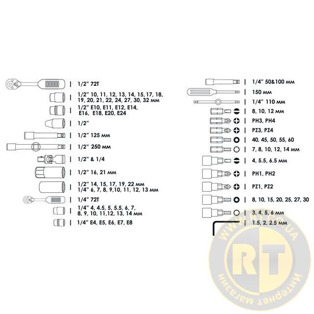 - Головка шестигранная торцевая 1/2" 17 шт.: 10, 11, 12, 13, 14, 15, 16, 17, 18, 19, 20, 21, 22, 24, 27, 30, 32 мм;
