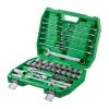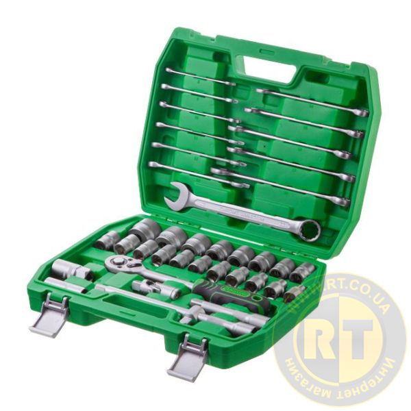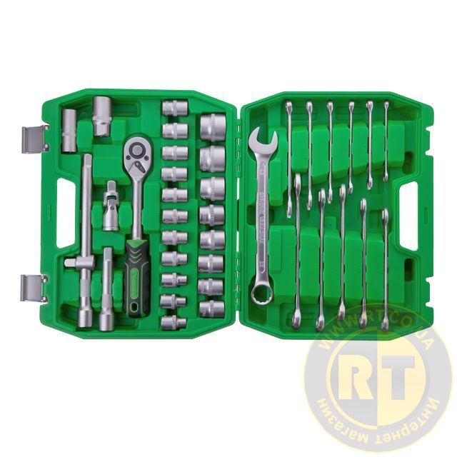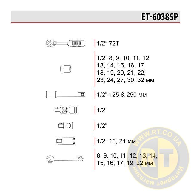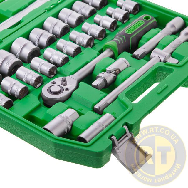 Набор с комплектацией в 38 единиц включает в себя трещотку с посадочным квадратом 1/2", набор шестигранных головок от 8 до 32 мм, подходят для выполнения разноплановых работ на закручивание и откручивание крепежей. На каждой головке нанесены насечки для предотвращения скольжения в руках.