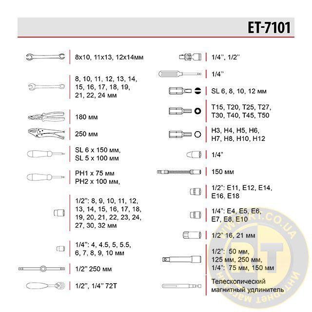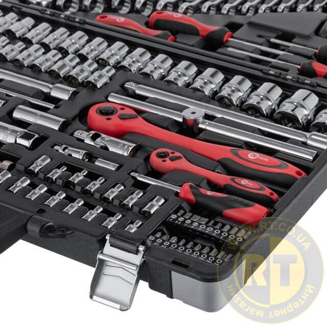 Основой набора являются две трещоточные рукоятки, с посадочными квадратам: 1/2" и 1/4", а также шестигранные головки размером от 4 до 32 мм. В комплекте добавлены головки E-типа с размерным рядом от E4 до E18, для работы с крепежами с типом профиля "звездочка",  который часто встречаются в современных автомобилях.