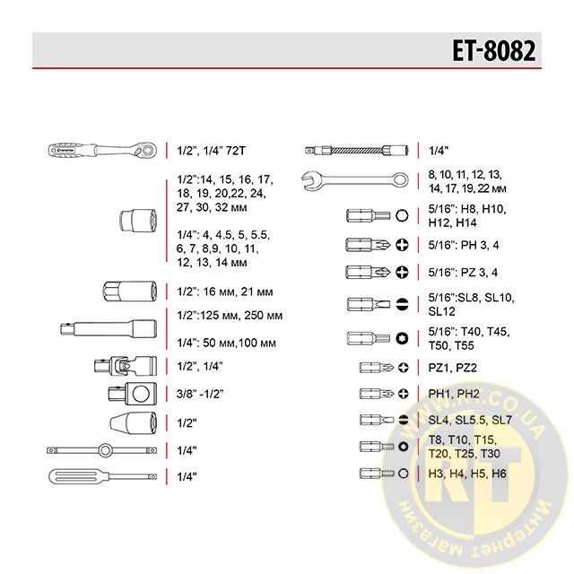 Набор инструментов STORM, 1/2" + 1/4", Cr-V, 82 ед., головки: 4-32 мм, биты 32 ед., ключи: 8-22 мм, кейс INTERTOOL ET-8082