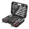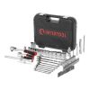 В набор включены все необходимые инструменты для работы с автомобилем, мототехникой, велотехникой и пр. Основой комплекта являются две трещоточные рукоятки с приводом 1/2" и 1/4", шестигранные головки, 9 рожково-накидных ключей со сбалансированной рукояткой, подходят для выполнения разноплановых работ на закручивание и откручивание крепежей. Свечные головки с резиновыми вставками 16 и 21мм потребуются для удобного монтажа свечей зажигания.