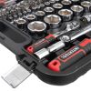 Все инструменты помещены в ударопрочный кейс с надежными металлическими замками и усиленными петлями. Комплектующие прочно зафиксированы на своих посадочных местах и не выпадают при транспортировке. Благодаря своим небольшим габаритам (380*297*80 мм), набор поместится в любой кладовке, бардачке или на полке в гараже. Современный яркий дизайн кейса точно не оставит никого равнодушным!