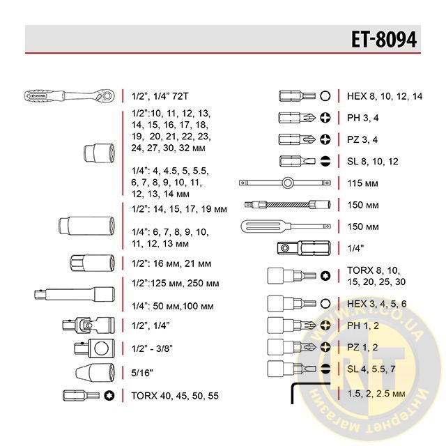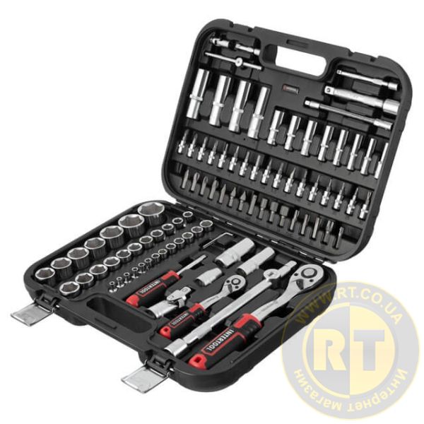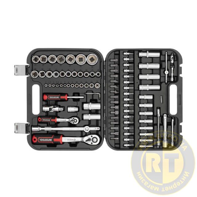Набор инструментов STORM, 1/2" + 1/4", Cr-V, 94 ед., головки: 4-32 мм, биты 32 ед., удл. головки: 6-19 мм, кейс INTERTOOL ET-8094