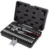 Все элементы изготовлены из высококачественной хромованадиевой стали CrV 50BV30. Отличительной чертой данной марки стали является большое количество легирующих добавок, благодаря чему материал становится менее склонным к хрупкому разрушению и увеличивает надежность при эксплуатации. Трехслойное хромоникелевое покрытие увеличивает срок службы инструмента и предотвращает коррозию. Комплект содержит оптимальный набор приспособлений для выполнения различных видов работ в мастерской, на автосервисе, гараже или СТО, а также для различных бытовых нужд.