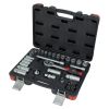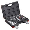 Все элементы изготовлены из высококачественной хромованадиевой стали CrV 50BV30. Отличительной чертой данной марки стали является большое количество легирующих добавок, благодаря чему материал становится менее склонным к хрупкому разрушению и увеличивает надежность при эксплуатации. Трехслойное хромоникелевое покрытие увеличивает срок службы инструмента и предотвращает коррозию. Комплект содержит оптимальный набор приспособлений для выполнения различных видов работ в мастерской, на автосервисе, гараже или СТО, а также для различных бытовых нужд.