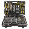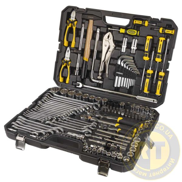 Стоит отметить, что в комплектация набора дополнена молотком, отвертками (ударними и обычними), плоскогубцами, бокоревами, клещами зажимными, а также различными видами гаечных ключей: комбинированные, разрезные, накидные с трещоткой. Данные инструменты увеличивают универсальность набора.