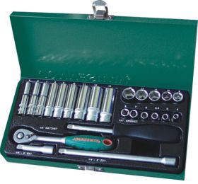 Состав набора:: 1/2", трещотка с реверсом на (72 зубца);головки: 10–22, 24, 27, 30, 32 мм;головки E-тип: E10, E11, E12, E14, E16, E18, E20, E24;головки удлиненные: 14, 15, 17, 19, 22 мм;удлинители 125 и 250 мм;тройной адаптер;карданный шарнир;голов- ки свечные 16 и 21 мм