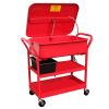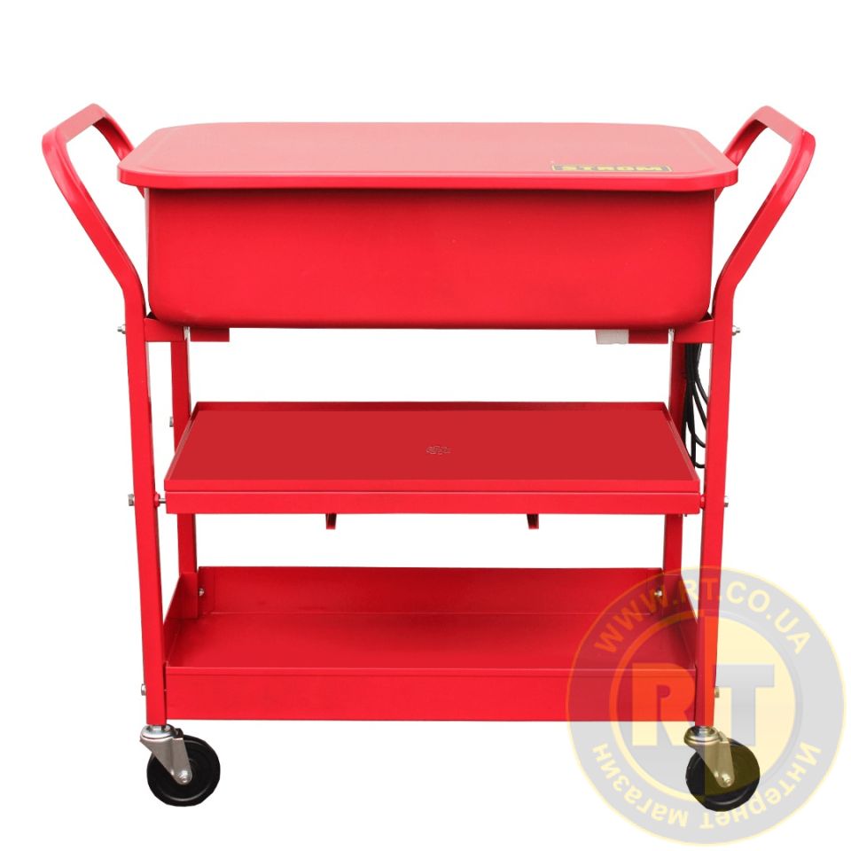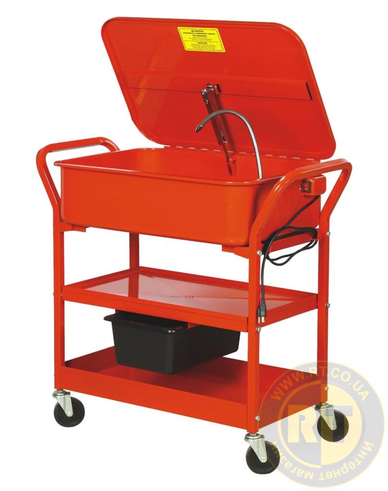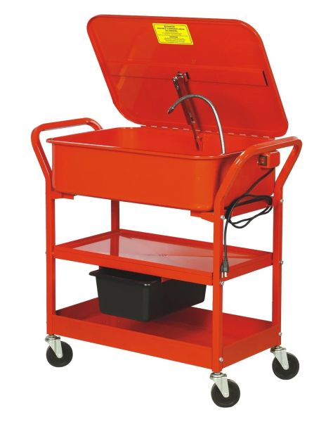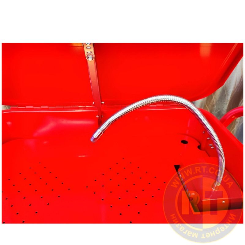 Ванна изготовлена из прочной стали с порошковым покрытием красного цвета, что обеспечивает долгие годы службы без протечек. Она оснащена гибкой насадкой, которая позволяет направлять раствор на основе воды в необходимое место. Крышка с предохранительной плавкой автоматически закрывается при превышении безопасной температуры, что обеспечивает безопасность в случае пожара. Мощный насос мощностью 23 Вт обеспечивает расход воды 21 литр в минуту. Для удобства очистки ванна оснащена сливной пробкой и съемным поддоном для рабочей поверхности.