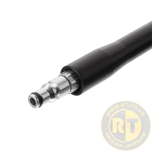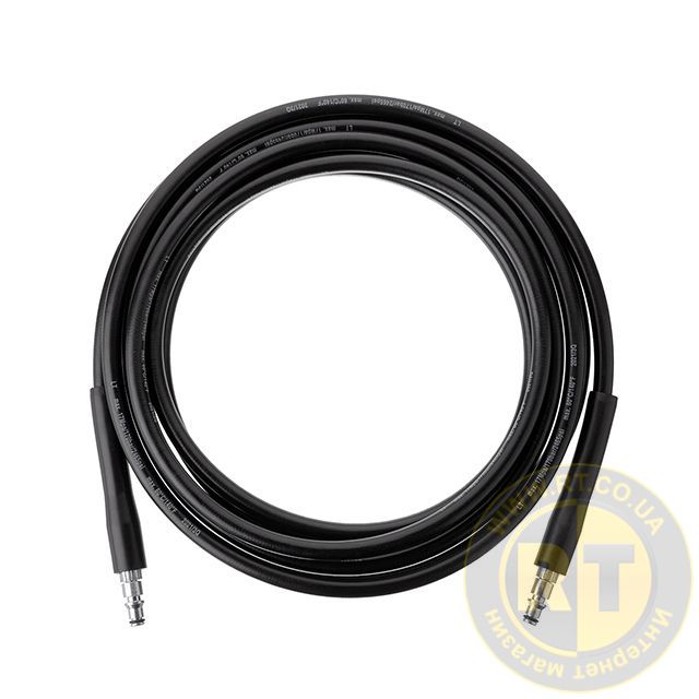 Шланг прочный и долговечный, выдерживает давление 80-110 бар. Быстросъемные соединения, установленные на концах шланга, помогают легко подключать и отключать шланг.