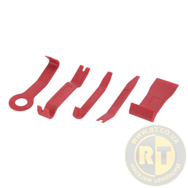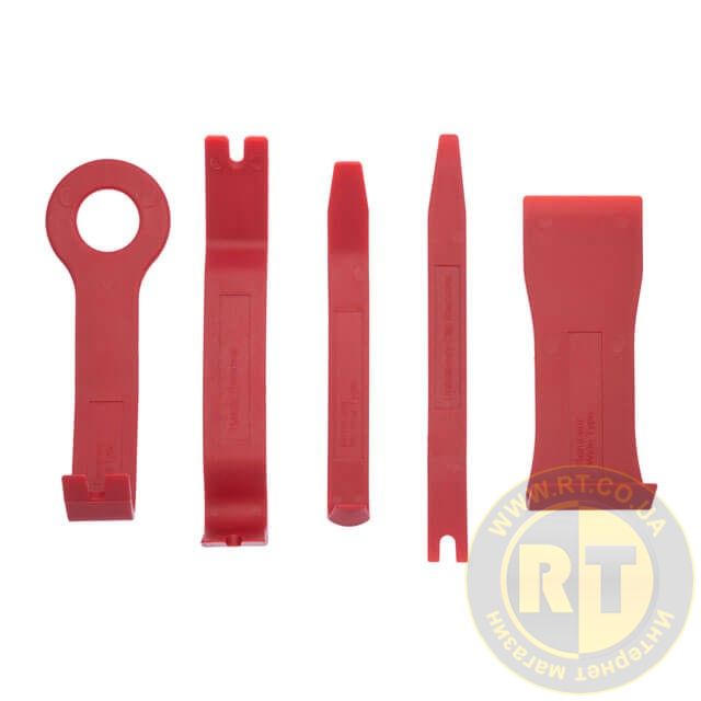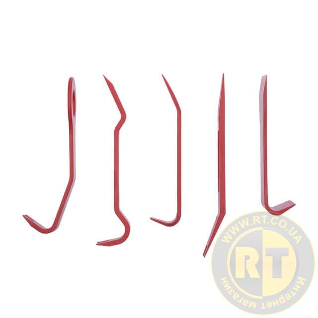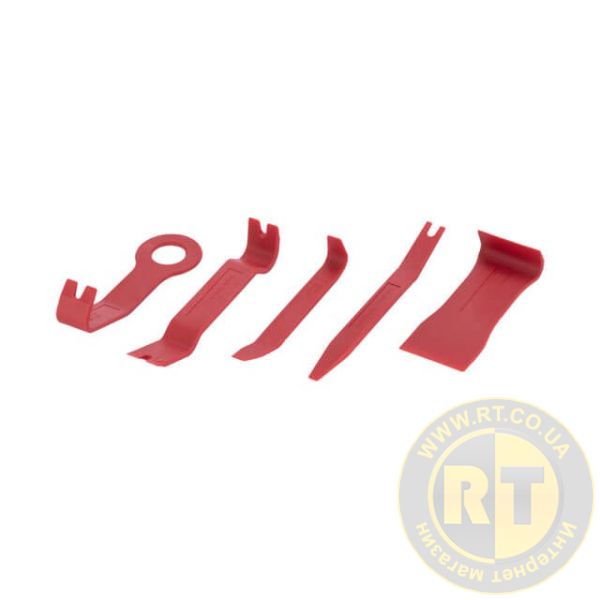 Набор включает в себя 5 предметов разной формы, с круглыми, острыми, широкими и узкими краями, которые позволяют работать с большинством панелей обшивки. На трех съемниках имеются прорези для демонтажа клипс крепления, также в каждом инструменте есть отверстие для его удобного хранения на стене.