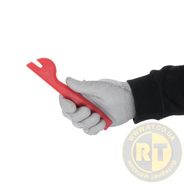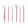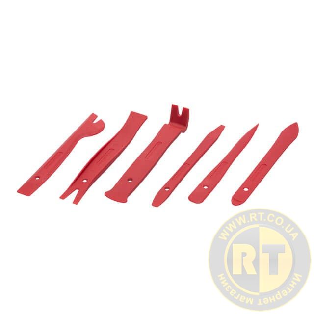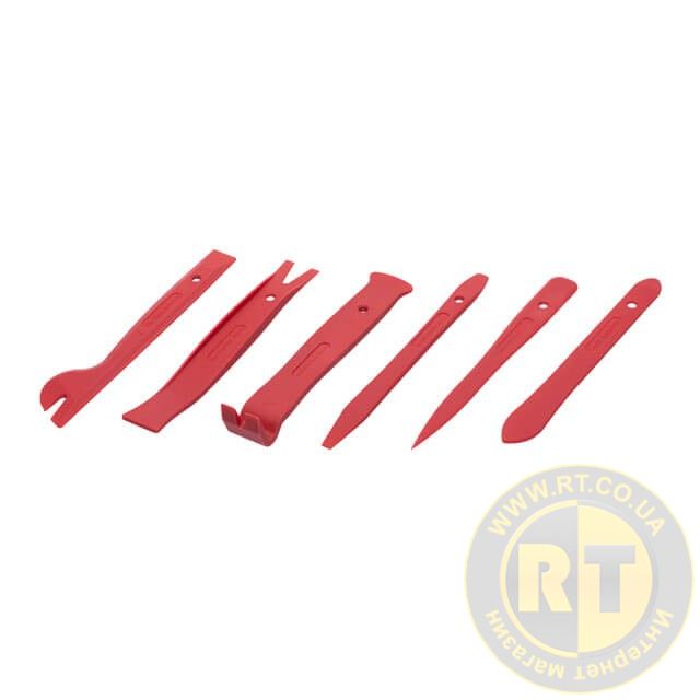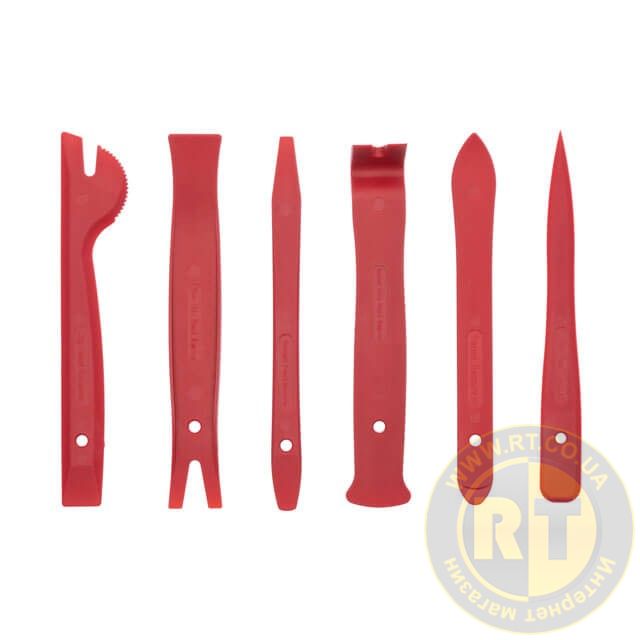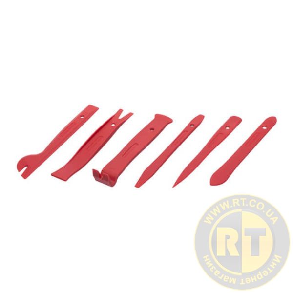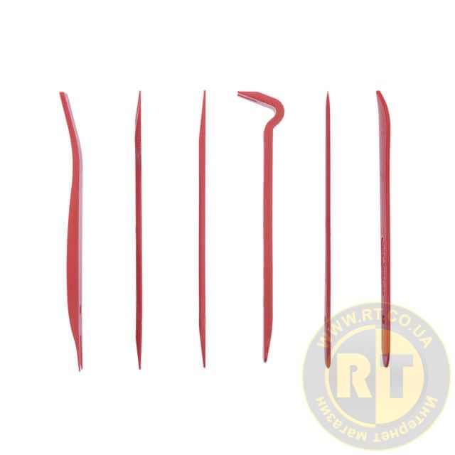 Набор включает в себя 6 предметов разной формы, с круглыми, острыми, широкими и узкими краями, которые позволяют работать с большинством панелей обшивки. На трех съемниках имеются прорези для демонтажа клипс крепления, также в каждом инструменте есть отверстие для его удобного хранения на стене. На съемниках отсутствуют задиры и швы, которые могут повредить обшивку или травмировать мастера.
