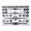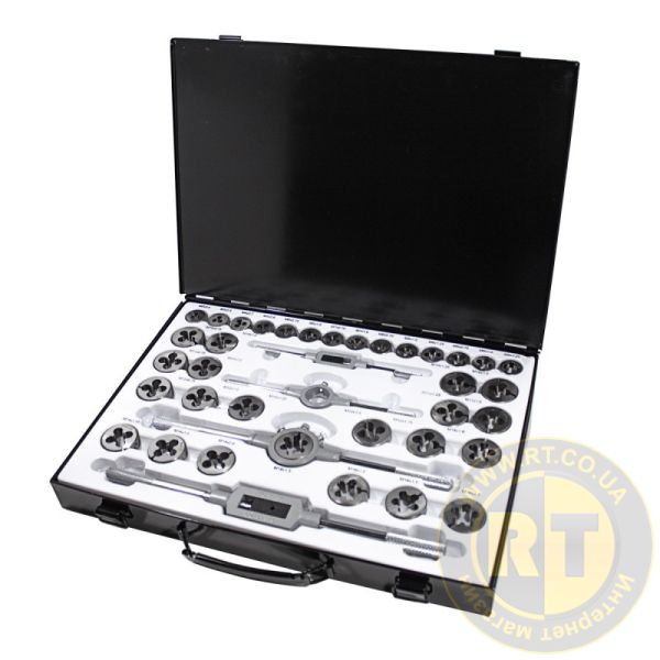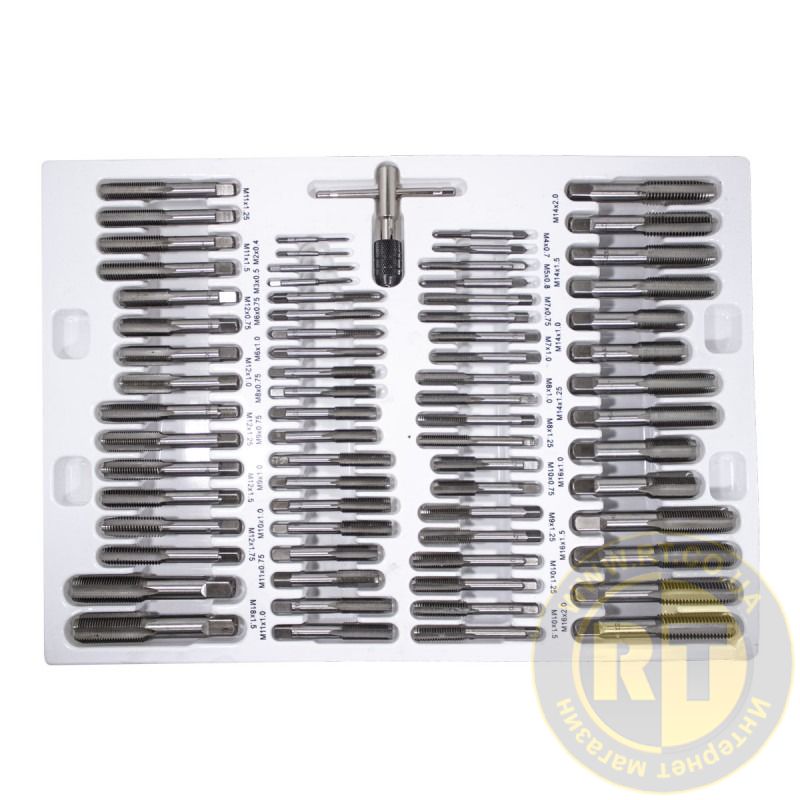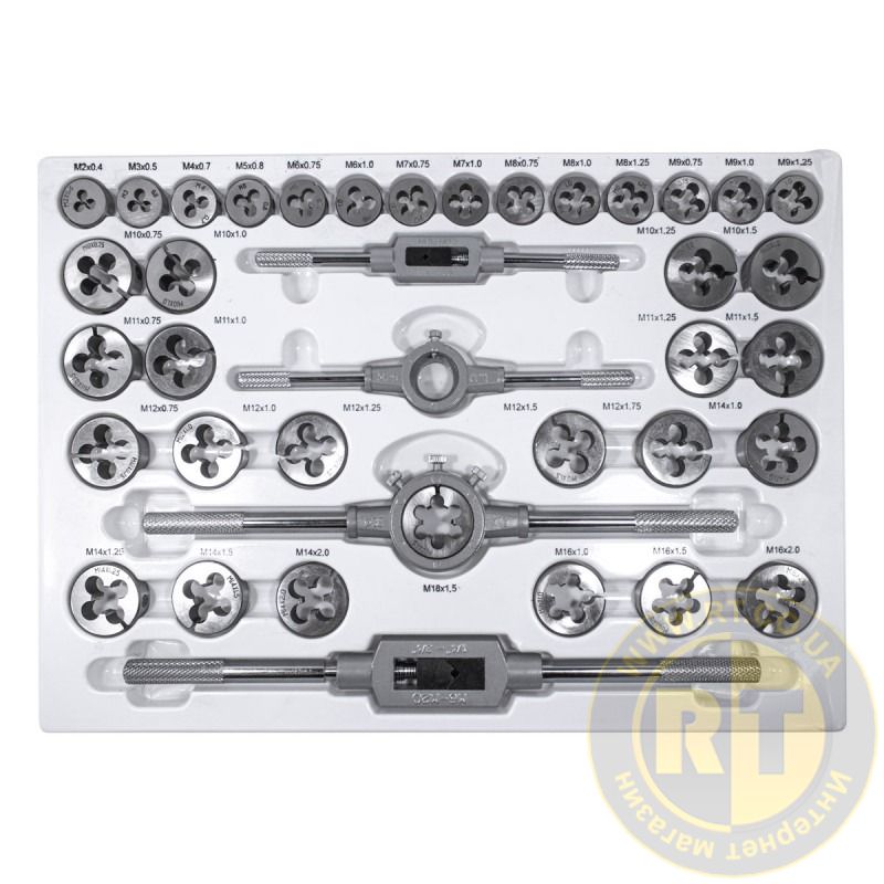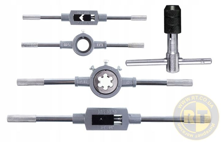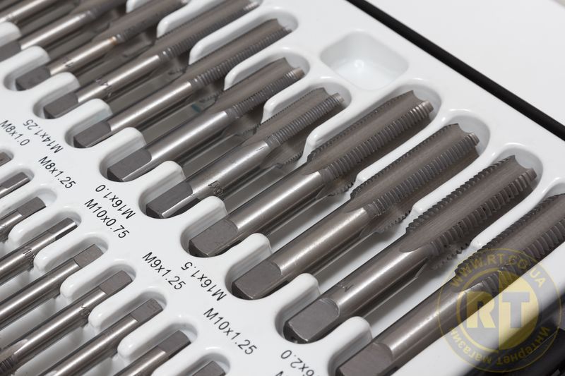 - Метчики и плашки: М2х0.4; М3х0.5; М4х0.7; М5х0.8; М6х1; М6х1,0; М6х0,75; М7х1,0; М7х0,75; М8х1,25; М8х1,0; М8х0,75; М9х0,75; М9х1,25; М9х1,0; М10х1,5;М10х1,25; М10х1,0;М10х0,75; М11х1,5; М11х1,25; М11х1,0; М11х0,75; М12х1,75; М12х1,5; М12х1,25; М12х1,0; М12х0,75; М14х2,0; М14х1,5; М14х1,25; М14х1,0; М16х2,0; М16х1,5; М16х1,0; М18х1,5. (Набор содержит метчики и плашки соответствующих размеров)