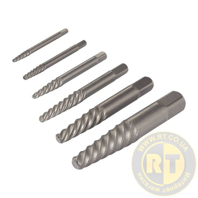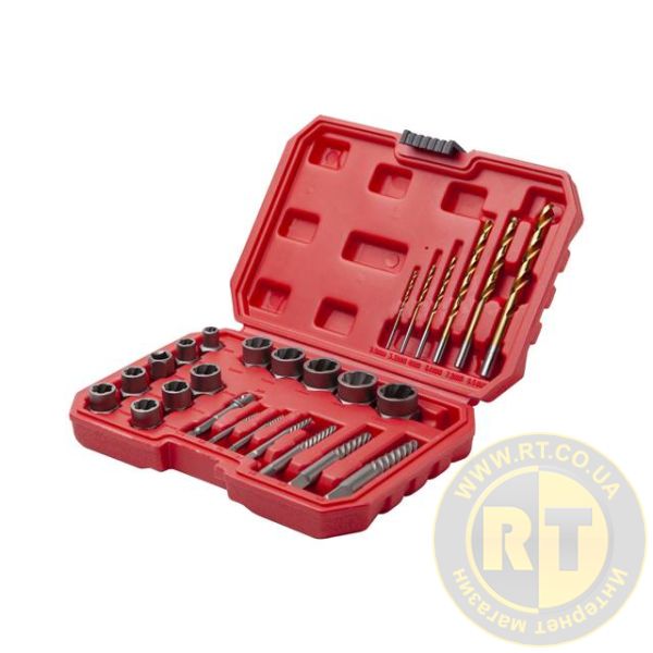 В набор входят 13 головок – внешних экстракторов разных размеров, а также 6 внутренних экстрактора для ввинчивания внутрь тела обломанного болта или в его шляпку. Наличие двух типов экстракторов позволяет максимально эффективно и безопасно отвинтить любой прикипевший или старый поврежденный крепеж. Сверла в комплекте помогут предварительно засверлить отверстия для дальнейшего демонтажа экстрактором.