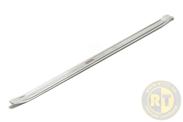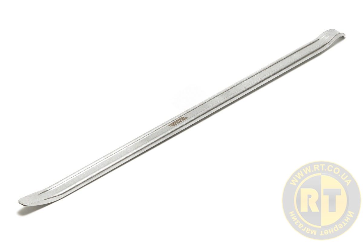 Инструмент изготовлен из высокопрочной закаленной стали, что гарантирует выносливость к значительным нагрузкам. Один конец имеет изогнутую форму, что позволяет поддевать, другой — прямой плоский, для отжимания и расклинивания.