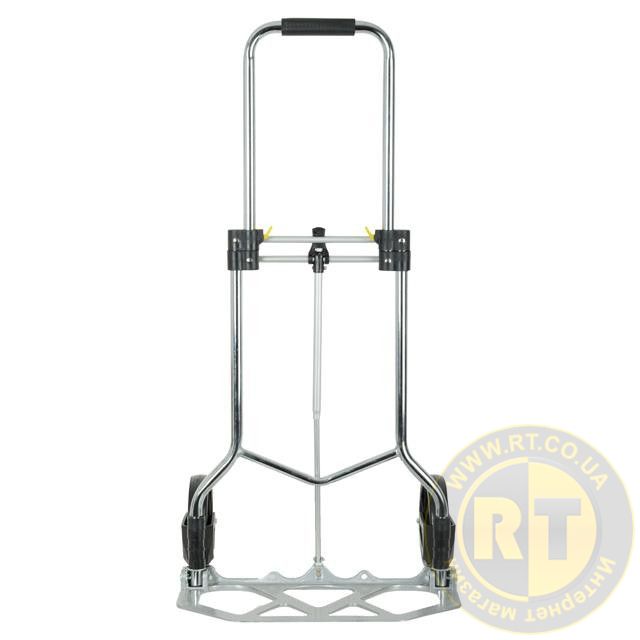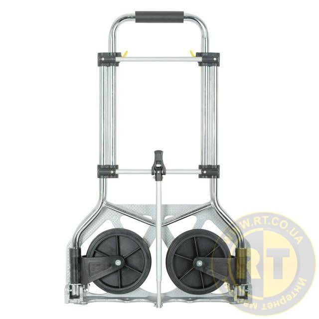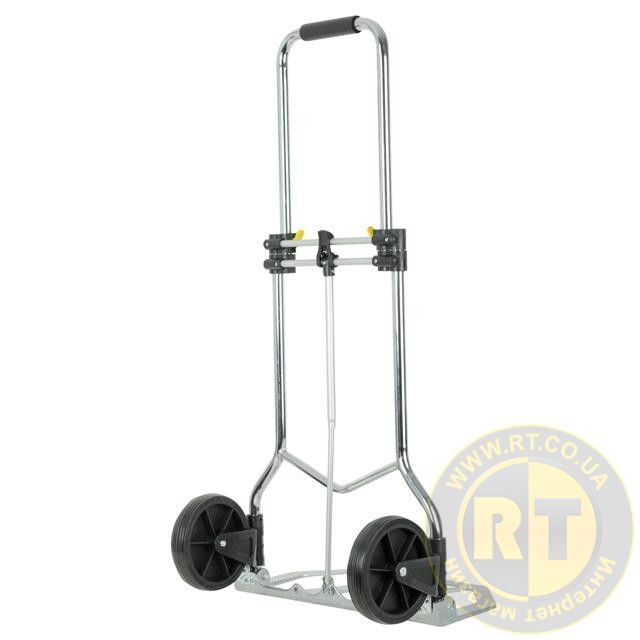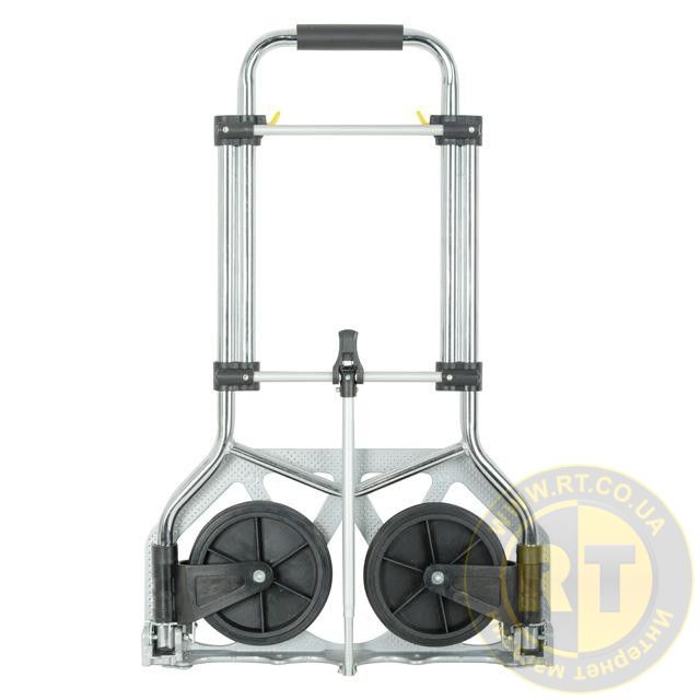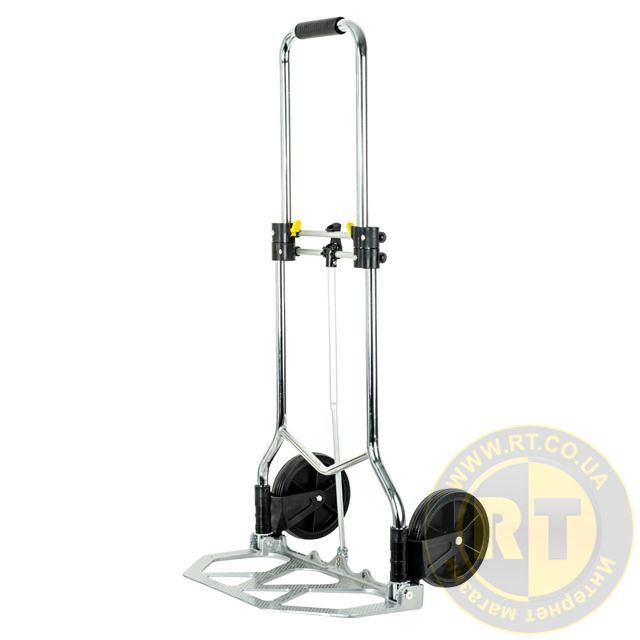 Тележка изготовлена из стали, служит надежно и долговечно. Выдвижная ручка, удобная по высоте (980 мм), фиксируется замком как в сложенном, так и в разложенном виде. Откидная алюминиевая платформа с габаритами 480х240 мм позволяет быстро подхватывать груз. Надежная, не гнется и не деформируется, благодаря ребрам жесткости, рифленой поверхности и загнутому опорному краю.