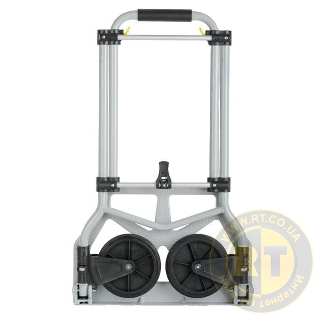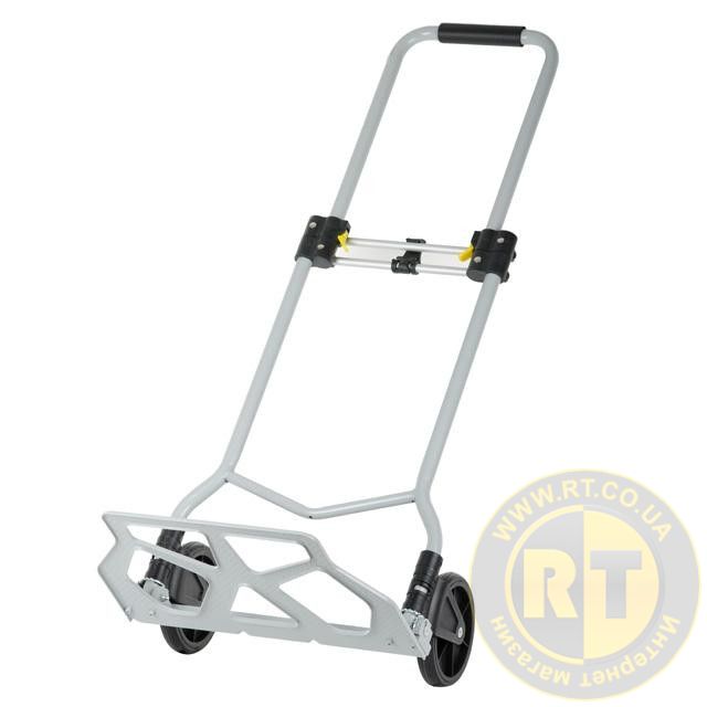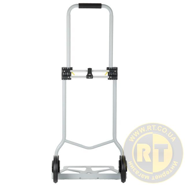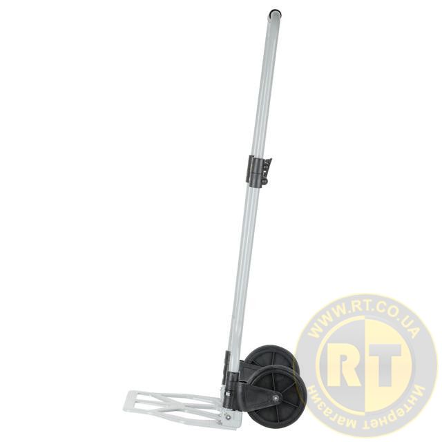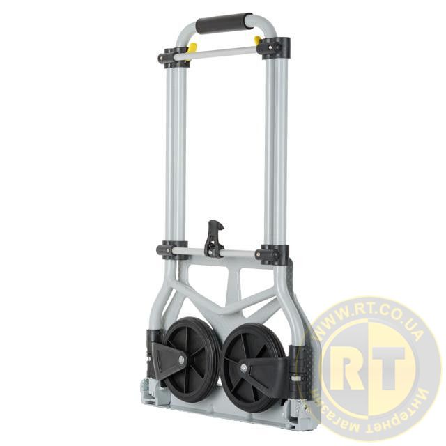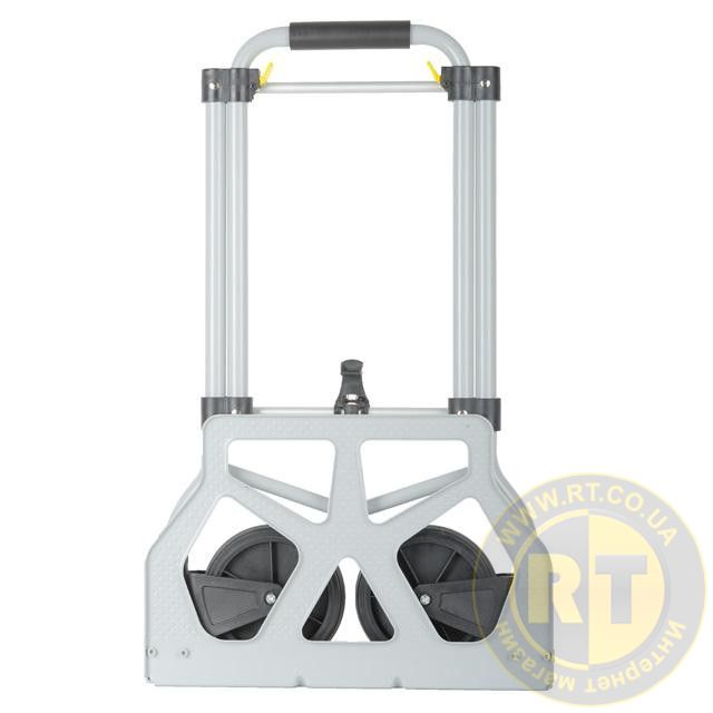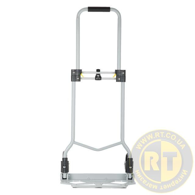 Тележка изготовлена из стали, служит надежно и долговечно. В выдвинутом состоянии ручка удобная по высоте (980 мм). Фиксируется замками, как в сложенном, так и в разложенном виде. Откидная стальная платформа с габаритами 420х280 мм позволяет быстро подхватывать груз. Платформа надежная, не гнется и не деформируется, благодаря ребрам жесткости, рифленой поверхности и загнутому опорному краю.