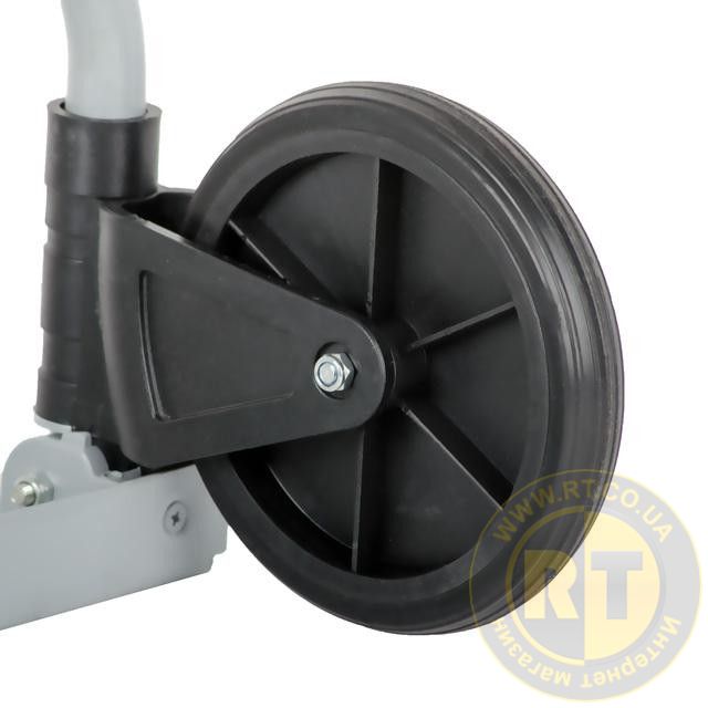 Прорезиненные колеса большого диаметра (150 мм) обладают мягким ходом. Ручная тележка очень отзывчива в управлении благодаря своему легкому весу, небольшим габаритам и ручке на удобной высоте.