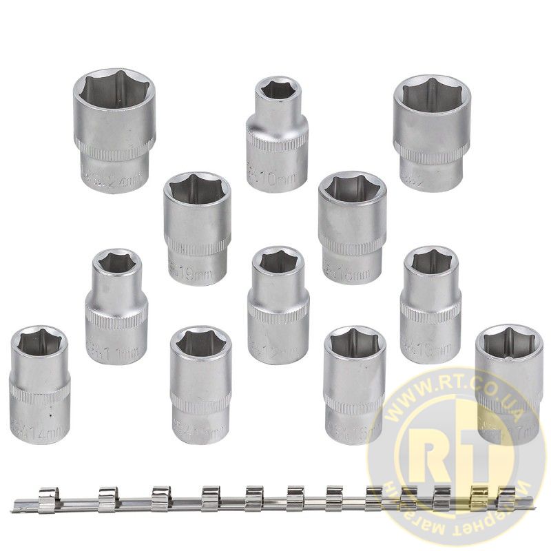 - Набор включает головки с посадочным квадратом 1/2'' и шестигранным профилем следующих размеров: 10; 11; 12; 13; 14; 15; 16; 17; 18; 19; 22; 24 мм