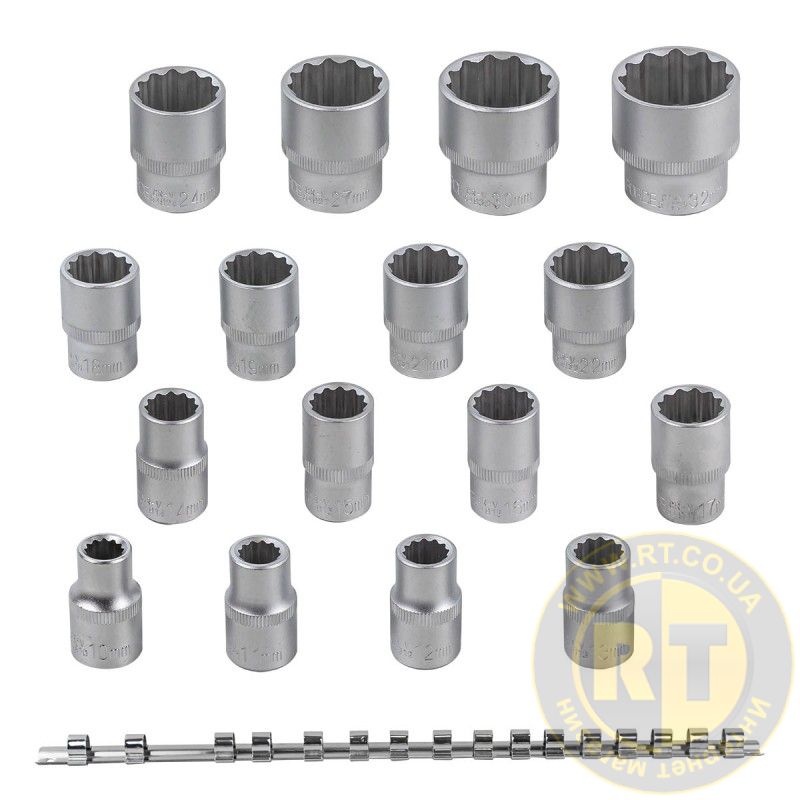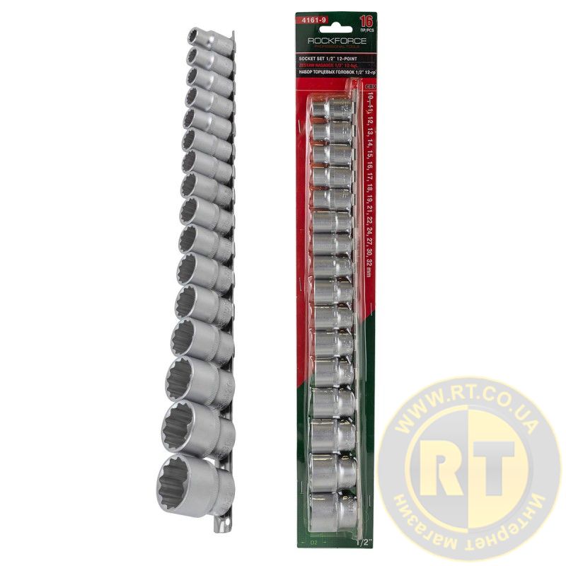 Набор головок 16 предметов 1/2" (12гр.)(10-19,21,22,24,27,30,32мм) на планке ROCKFORCE RF-4161-9