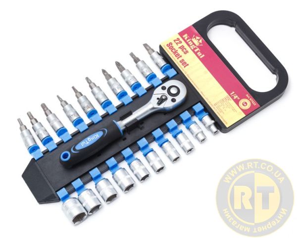 Код товара: 2797, Состав: Набор головок и головок-бит с трещоткой в пласт. держателе 22пр. 1/4" (5-14мм, 6-гран.) KINGTUL KT422