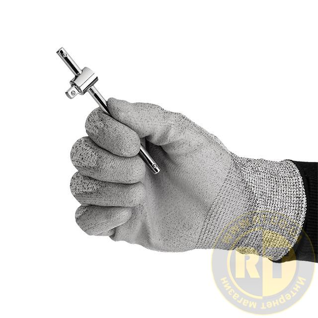 Головки надежно фиксируются на посадочных квадратах трещоток, не спадают и плотно прилегают к поверхности крепежа. Удобство работы с Т-образным воротком заключается в его плавающей головке, которая передвигается от одного конца воротка до другого. Это способствует фиксации плавающей головки по центру и возможности обхвата штанги воротка с обеих сторон.