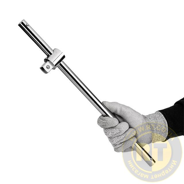 Головки надежно фиксируются на посадочных квадратах трещоток, не спадают и плотно прилегают к поверхности крепежа. Удобство работы с Т-образным воротком заключается в его плавающей головке, которая передвигается от одного конца воротка до другого. Это способствует фиксации плавающей головки по центру и возможности обхвата штанги воротка с обеих сторон.