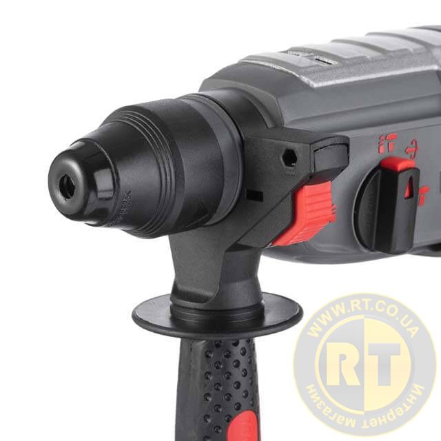 Перфоратор оснащен боковой рукояткой, предназначенной для удобного перехвата инструмента в работе. Рукоятка может быть установлена под левую или правую руку для комфортного использования.