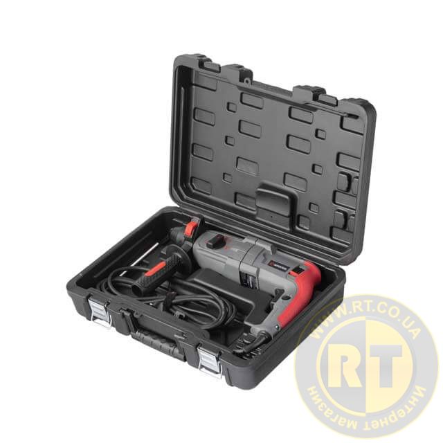 Перфоратор и все комплектующие аксессуары упакованы в надежный кейс с дополнительными ребрами жесткости для большей прочности.