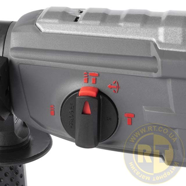 Также для удобства при выполнении длительных работ предусмотрен фиксатор кнопки включения. Кроме вышеперечисленных режимов работы, в перфораторе предусмотрен реверс, который необходим при заклинивании оснастки, для ее освобождения.