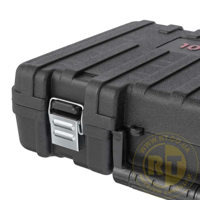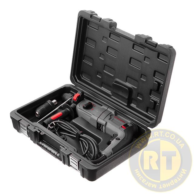 Перфоратор и все комплектующие аксессуары упакованы в надежный кейс с дополнительными ребрами жесткости для большей прочности. Металлические замки на кейсе уберегут от случайного раскрытия и долго прослужат, широкая ручка на кейсе позволит удобно переносить перфоратор и всю оснастку.