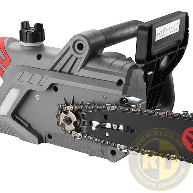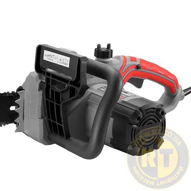 Для увеличения безопасности во время работы, в электропиле реализована система защиты от случайного пуска. Функция аварийной остановки реализована возле передней ручки - как только на нее нажимает оператор срабатывает защита: останавливается цепь и отключается питание двигателя. Не стоит забывать, что любой электроинструмент травмоопасен. Во избежание травм, при работе пилой очень важно соблюдать технику безопасности, а также использовать средства личной защиты!