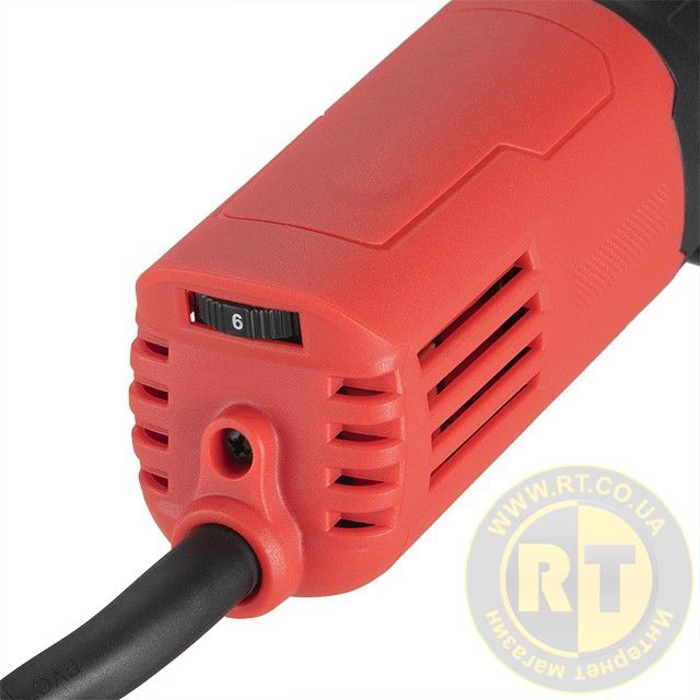 Шлифмашина оснащена регулятором оборотов, что позволяет настроить скорость вращения диска в диапазоне от 6000 до 12200 об/мин для выполнения различных задач. Максимально равномерная обработка поверхностей возможна благодаря электронной системе поддержания оборотов. Вращение диска не замедляется даже при значительном усилии на инструмент.