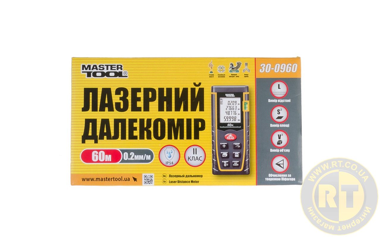 Дальномер лазерный до 60 м ±2 мм/м память 30 класс лазера I IP54 питание АААх2 чехол MASTERTOOL 30-0960