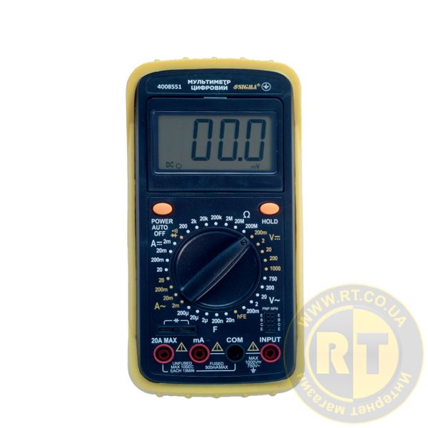 Мультиметр цифровой профи SIGMA (4008551) с ЖК дисплеем, имеющий разрешение 3 1/2" разряда, который предназначен для измерения постоянного и переменного напряжения, постоянного и переменного тока, сопротивления, тестирования транзисторов, а также прозвона цепи на обрыв.