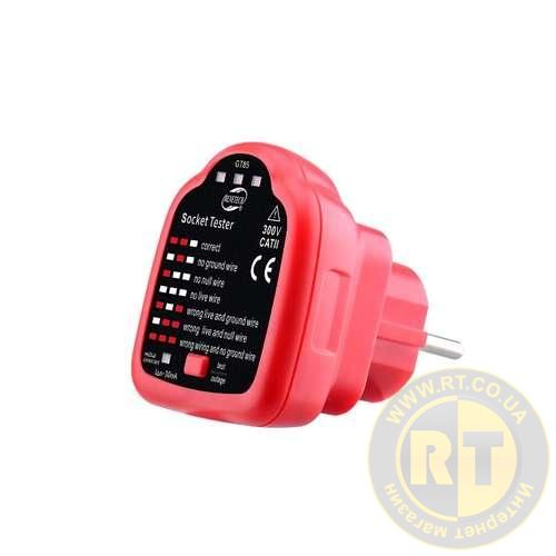 Benetech GT85 – профессиональный прибор для проверки подключения фазы, нуля и заземления в розетке, а также проверки срабатывания УЗО путем создания нагрузки 30 мА.