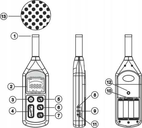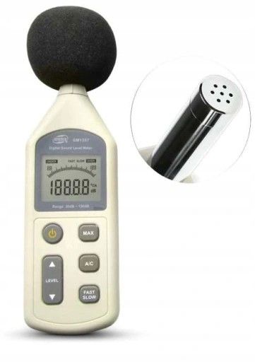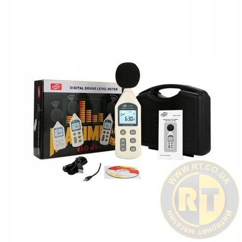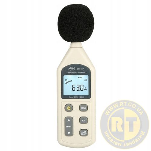 Цифровой шумомер GM1357 определяет уровень интенсивности шума. Используется для контроля уровня шума в целях охраны здоровья.Цифровой шумомер GM1357 ― портативный электронный прибор, который получает аналоговые сигналы от звуковых колебаний и преобразует их в цифровые. Определяет уровень интенсивности шума в диапазоне от 30 дБ до 130 дБ. Показания выводятся на большой ЖК дисплей в числовом виде и в виде графической шкалы и могут передаваться на компьютер для последующей обработки. Диапазон графической шкалы 50 дБ с ценой деления 1 дБ.Преимущества и особенности шумомера Benetech GM1357:1. Мгновенное измерение уровня звука2. Диапазон измерения: 30...130 дБ. Прибор показывает значение уровня звука в пределах одного из четырех под диапазонов: 30...80 дБ, 50...100 дБ, 60...110 дБ, 80...130 дБ3. Графическая круговая шкала: на 50 дБ с шагом 1 дБ для наблюдения за уровнем звука в пределах текущего под диапазона, периодичность отображения 50 мс4. Питается от батарейки «крона» (в комплекте), также имеется гнездо для подключения адаптера.5. Индикаторы «OVER» и «UNDER» для сигнализации о выходе измеряемого уровня звука за верхний или нижний пределы диапазона измерения соответственно6. Два типа взвешивающего фильтра: A и C7. Функция быстрого или медленного снятия показаний (FAST/SLOW)8. Функция удержания максимального значения (MAX)9. Выходной аналоговый сигнал переменного (AC) и постоянного (DC) тока10. Полудюймовый электронный конденсаторный микрофон, оснащенный ветрозащитой – поролоновым шариком, надеваемым при порывах ветра.