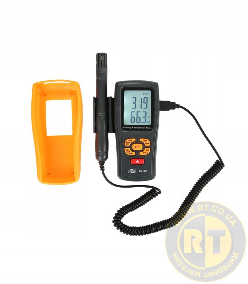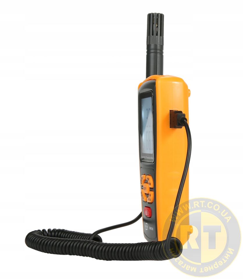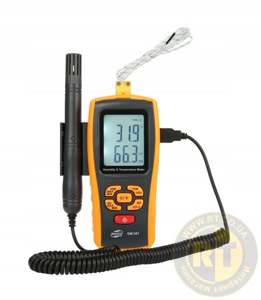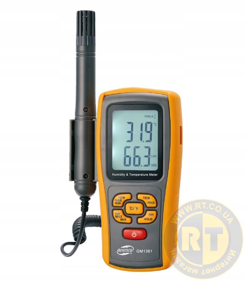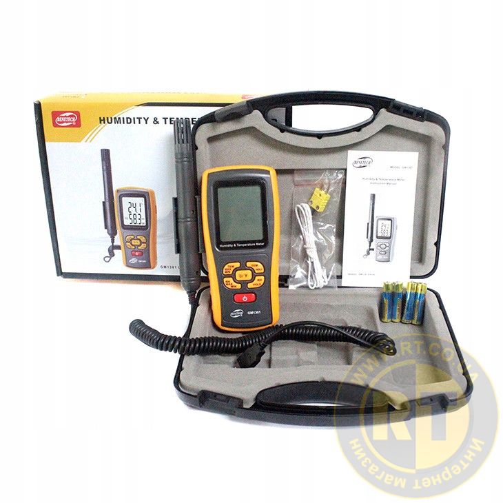 Измеритель температуры и влажности GM1361 предназначен для измерения температуры и влажности воздуха. Прибор может применяться в лабораториях, на складах, в системах кондиционирования воздуха, для контроля параметров окружающей среды и т.п.Преимущества и особенности термо-гигрометра Benetech GM1361:1. Одновременное измерение температуры и влажности.2. Точка росы3. Температура мокрого металлического шарика4. Измерение максимальных/минимальных значений температуры и влажности (MAX/MIN).5. Функция удержания показаний (HOLD). 6. Пыле и влагозащищённый корпус в резиновом чехле для повышения износоустойчивости7. Высокая скорость проведения измерений8. Выносной датчик для измерения влажности воздуха в труднодоступных местах9. Различные единицы измерения температуры (°C/°F).10. Индикатор уровня зарядки батареи.11. Автоматическое отключение. 12. Вход для подключения термопары К-типа для расширения диапазона измерения температуры до −30...+1000°С.
