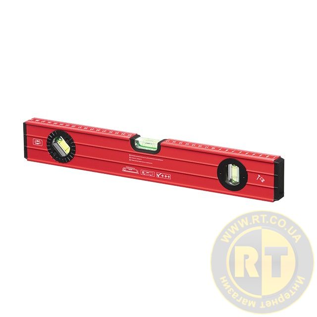 Уровень очень легкий, не перегружает руки, им удобно работать длительное время. Сверху уровня нанесена метрическая линейка для более удобной работы. В моделях длиной от 600 мм до 2000 мм предусмотрено два эргономичных отверстия для захвата, что увеличивает комфорт в работе, особенно в труднодоступных местах.